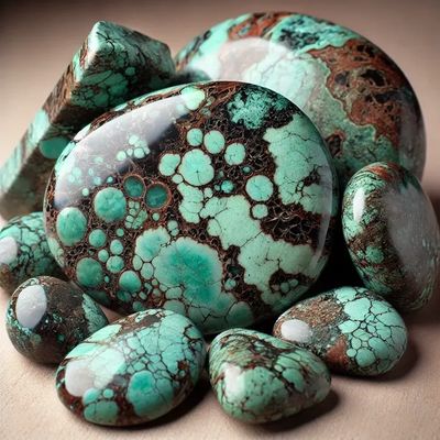 Despite its name, African Turquoise is not true turquoise but a form of jasper found primarily in Africa. It is composed of a variety of chalcedony, rich in copper and iron, which gives it its distinctive blue-green coloration. The stone often features black, brown, or gray web-like inclusions, adding to its unique appearance.